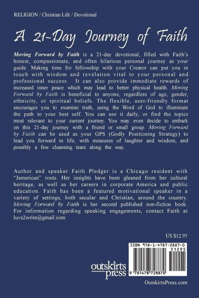 Moving Forward by Faith is a 21-day devotional, filled with Faith's honest, compassionate, and often hilarious personal journey as your guide. Making time for fellowship with your Creator can put you in touch with wisdom and revelation vital to your personal and professional success. It can also provide immediate rewards of increased inner peace which may lead to better physical health. Moving Forward by Faith is beneficial to anyone, regardless of age, gender, ethnicity, or spiritual beliefs. The flexible, user-friendly format encourages you to examine truth, using the Word of God to illuminate the path to your best self. You can use it daily, or find the topics most relevant to your current journey. You may even decide to embark on this 21-day journey with a friend or small group. Moving Forward by Faith can be used as your GPS (Godly Positioning Strategy) to lead you forward in life, with measures of laughter and wisdom, and possibly a few cleansing tears along the way.