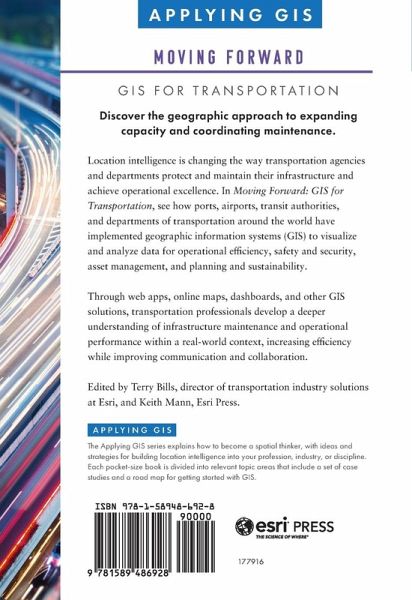GIS for Transportation Drive innovation, expand capacity, coordinate maintenance, and reduce costs. Location intelligence is changing the way transportation agencies and departments protect and maintain their infrastructure and achieve operational excellence. In Moving Forward: GIS for Transportation, see how ports, airports, transit authorities, and departments of transportation around the world have implemented geographic information systems (GIS) to visualize and analyze data for operational efficiency, safety and security, asset management, and planning and sustainability. Through web apps, online maps, dashboards, and other GIS solutions, transportation professionals develop a deeper understanding of infrastructure maintenance and operational performance within a real-world context, increasing efficiency, while improving communication and collaboration. Edited by Terry Bills, Esri's director of transportation industry solutions, and Keith Mann, Esri Press.