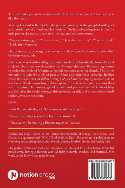 The death of a parent is an incalculable loss because no one will ever love you like that again. Moving Forward is Rabhya Singh's personal journey as she grappled with grief and a mishmash of unexplainable emotions. The heart-breaking irony is that the only person she wants to talk to is her dad and he is not around. "You are a strong girl," "You are brave," "He is there in spirit, "You are loved," "Look after Mamma." Her brain was processing these incessantly flowing well-meaning advice while the heart was numb. Rabhya is blessed with a village of aunties, uncles and friends who formed a solid circle of Ubuntu to provide a safety net. Through this book Rabhya Singh wants to widen her circle of Ubuntu to include everyone grieving silently. This is her invitation to join the circle of pain and loss and experience catharsis. Rabhya shares her experience of different stages of grief and her coping mechanisms in this book. While journaling Rabhya spoke to professional guides, counsellors and therapists. Her aunties, grand aunties and peers offered all kinds of help and she takes the reader through this rollercoaster ride and as you exhale you'll realize...you are not alone. PS: Rohit Raj, we asked grief, "How long would you stay?" "For as many days as you love him," she answered. "Then we will be sharing a lifetime together," we said.
