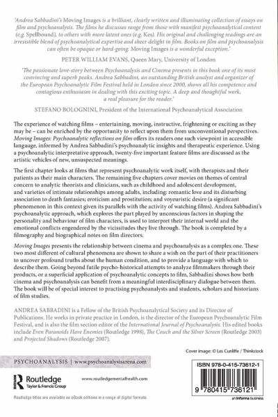 Andrea Sabbadini is a Fellow of the British Psychoanalytical Society and its Director of Publications. He works in private practice in London, is the director of the European Psychoanalytic Film Festival, and is also the film section editor of the International Journal of Psychoanalysis. He is the author of Boundaries and Bridges (Karnac 2014) and the editor of Even Paranoids Have Enemies (Routledge 1998), The Couch and the Silver Screen (Routledge 2003) and Projected Shadows (Routledge 2007).