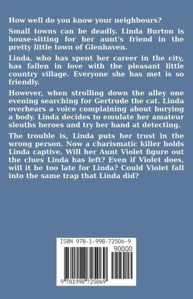 How well do you know your neighbours? Small towns can be deadly. Linda Burton is house-sitting for her aunt's friend in the pretty little town of Glenhaven. Linda, who has spent her career in the city, has fallen in love with the pleasant little country village. Everyone she has met is so friendly. However, when strolling down the alley one evening searching for Gertrude the cat. Linda overhears a voice complaining about burying a body. Linda decides to emulate her amateur sleuths heroes and try her hand at detecting. The trouble is, Linda puts her trust in the wrong person. Now a charismatic killer holds Linda captive. Will her Aunt Violet figure out the clues Linda has left? Even if Violet does, will it be too late for Linda? Could Violet fall into the same trap that Linda did?