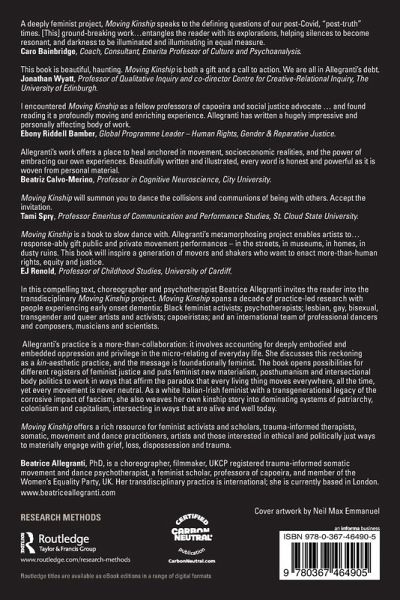 In this compelling text, choreographer and psychotherapist Beatrice Allegranti invites the reader into the transdisciplinary Moving Kinship project. Moving Kinship spans a decade of practice-led research with people experiencing early onset dementia; Black feminist activists; psychotherapists; lesbian, gay, bisexual, transgender and queer artists and activists; capoeiristas; and an international team of professional dancers and composers, musicians and scientists.