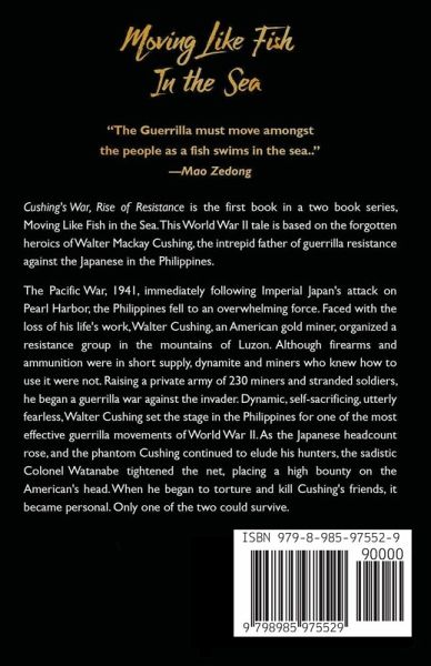 Cushing War, Rise of the Resistance is the first in a two book series, Moving Like Fish in the Sea. This World War II tale is based on the forgotten heroics of Walter Mackay Cushing, the intrepid father of guerrilla resistance against the Japanese in the Philippines. The Pacific War, 1941, immediately following Imperial Japan's attack on Pearl Harbor, the Philippines fell to an overwhelming force. Faced with the loss of his life's work, Walter Cushing, an American gold miner, organized a resistance group in the mountains of Luzon. Although firearms and ammunition were in short supply, dynamite and miners who knew how to use it were not. Raising a private army of 230 miners and stranded soldiers, he began a guerrilla war against the invader. Dynamic, self-sacrificing, utterly fearless, Walter Cushing set the stage in the Philippines for one of the most effective guerrilla movements of World War II. As the Japanese headcount rose, and the phantom Cushing continued to elude his hunters, the sadistic Colonel Watanabe tightened the net, placing a high bounty on the American's head. When he began to torture and kill Cushing's friends, it became personal. Only one of the two could survive.