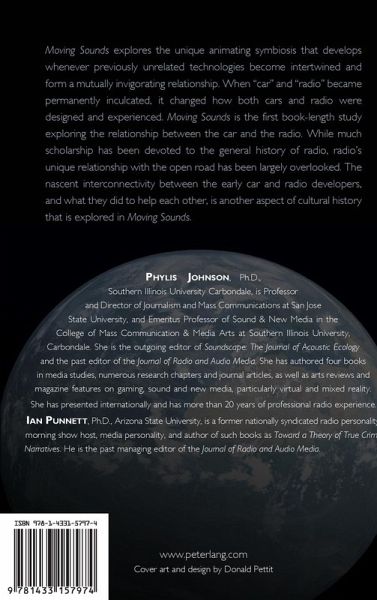 Figures - Robin Bertolucci: Moving Foreword: Why This Book Matters - Phylis Johnson/Ian Punnett: Preface: How to Use This Book - Phylis Johnson: A Few Words and Acknowledgments - Phylis Johnson/Ian Punnett: Moving Sounds: An Introduction - Phylis Johnson: The Road Trip in the Making - Donna Halper: On Women and Radio: Women in the Driver's Seat - Phylis Johnson: Got Jesus in My Car Radio: Evangelism on the Road - Wafa Unus: From Airplane to "Zeppelin": A Quick Primer on Radio Traffic Reporting - Philip Jeter: Enter the Forties: Riding on Fumes, and Traveling with Talk and Tunes - Lady Dhyana Ziegler: Cadillac Radio - Jenny Johnson/Phylis Johnson: A Tidal Wave of Change: Surfin' the Sixties on the Dashboard - Justin A. Williams: Los Angeles, Popular Music, and the Automobile - Ian Punnett: Car Trek: Morning Drive Radio ... in Space! - Phylis Johnson/Jonathan Pluskota: Blackout: Testing the Airwaves and Hanging on by a Thread - Tim Hendrick: The Silver Age of AM/FM/Tape Car Stereos: An Oral History - Phylis Johnson: Role-Playing on Virtual Highways: Simulations and Soundscapes: What's Inside the Connected Car of Tomorrow? - Jay Needham: Appendix: "Blacktop: The Radio Play" - Contributors - Index.