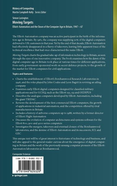 "Moving Targets details the history of Elliott Brothers in 1947 through to the last vestige of those families of Elliott's computers in GEC Computers in the 1990s. The title of the book Moving Targets is surely a reference to the recurring technical and marketing themes described by the book. ... there is no doubt that the whole book is exceptionally well researched to a superb accuracy. ... the book contains many interesting pictures." (Roger Newey, Resurrection - The Bulletin of the Computer Conservation Society, Issue 55, Summer, 2011)