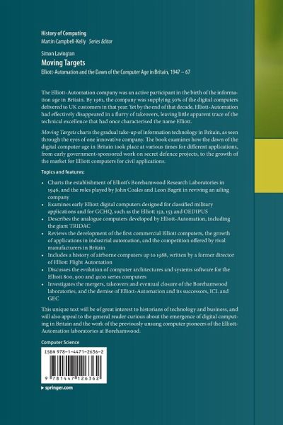"Moving Targets details the history of Elliott Brothers in 1947 through to the last vestige of those families of Elliott's computers in GEC Computers in the 1990s. The title of the book Moving Targets is surely a reference to the recurring technical and marketing themes described by the book. ... there is no doubt that the whole book is exceptionally well researched to a superb accuracy. ... the book contains many interesting pictures." (Roger Newey, Resurrection - The Bulletin of the Computer Conservation Society, Issue 55, Summer, 2011)