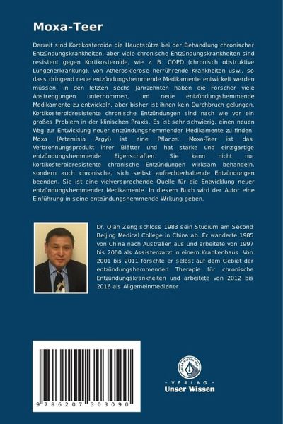Derzeit sind Kortikosteroide die Hauptstütze bei der Behandlung chronischer Entzündungskrankheiten, aber viele chronische Entzündungskrankheiten sind resistent gegen Kortikosteroide, wie z. B. COPD (chronisch obstruktive Lungenerkrankung), von Atherosklerose herrührende Krankheiten usw., so dass dringend neue entzündungshemmende Medikamente entwickelt werden müssen. In den letzten sechs Jahrzehnten haben die Forscher viele Anstrengungen unternommen, um neue entzündungshemmende Medikamente zu entwickeln, aber bisher ist ihnen kein Durchbruch gelungen. Kortikosteroidresistente chronische Entzündungen sind nach wie vor ein großes Problem in der klinischen Praxis. Es ist sehr schwierig, einen neuen Weg zur Entwicklung neuer entzündungshemmender Medikamente zu finden. Moxa (Artemisia Argyi) ist eine Pflanze. Moxa-Teer ist das Verbrennungsprodukt ihrer Blätter und hat starke und einzigartige entzündungshemmende Eigenschaften. Sie kann nicht nur kortikosteroidresistente chronische Entzündungen wirksam behandeln, sondern auch chronische, sich selbst aufrechterhaltende Entzündungen beenden. Sie ist eine vielversprechende Quelle für die Entwicklung neuer entzündungshemmender Medikamente. In diesem Buch wird der Autor eine Einführung in seine entzündungshemmende Wirkung geben.