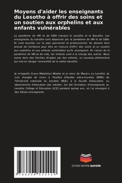 La pandémie de VIH et de SIDA menace le Lesotho et le Basotho. Les enseignants du Lesotho sont dépassés par la pandémie de VIH et de SIDA. Ils sont touchés sur le plan personnel et professionnel. Ils doivent faire preuve de résilience pour être en mesure d'offrir des soins et un soutien aux orphelins et aux enfants vulnérables qu'ils enseignent. En raison de la pandémie de VIH et de sida, les enfants sont à la charge des autres. Nous avons donc des familles dirigées par des enfants, un nouveau phénomène qui met en danger l'ensemble de la nation basotho.