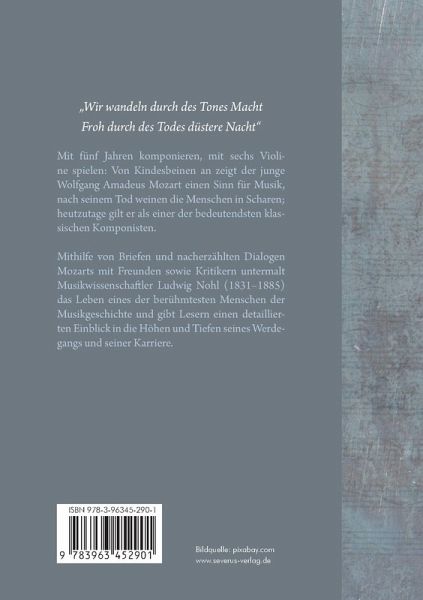 "Wir wandeln durch des Tones Macht/ Froh durch des Todes düstere Nacht". Mit fünf Jahren komponieren, mit sechs Violine spielen: Von Kindesbeinen an zeigt der junge Wolfgang Amadeus Mozart einen Sinn für Musik, nach seinem Tod weinen die Menschen in Scharen; heutzutage gilt er als einer der bedeutendsten klassischen Komponisten. Mithilfe von Briefen und nacherzählten Dialogen Mozarts mit Freunden sowie Kritikern untermalt Musikwissenschaftler Ludwig Nohl (1831-1885) das Leben eines der berühmtesten Menschen der Musikgeschichte und gibt Lesern einen detaillierten Einblick in die Höhen und Tiefen seines Werdegangs und seiner Karriere.