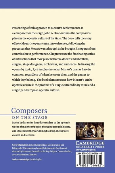 Presenting a fresh approach to Mozart's achievements as a composer for the stage, John A. Rice outlines the composer's place in the operatic culture of his time. The book tells the story of how Mozart's operas came into existence, following the processes that Mozart went through as he brought his operas from commission to performance. Chapters trace the fascinating series of interactions that took place between Mozart and librettists, singers, stage designers, orchestras, and audiences. In linking the operas by topic, Rice emphasizes what Mozart's operas have in common, regardless of when he wrote them and the genres to which they belong. Overall, the book demonstrates how Mozart's entire operatic oeuvre is the product of a single extraordinary mind and a single pan-European operatic culture.