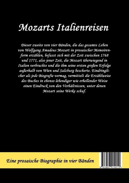 Dieser zweite von vier Bänden, die das gesamte Leben von Wolfgang Amadeus Mozart in prosaischer Memoirenform erzählen, befasst sich mit der Zeit zwischen 1768 und 1771, also jener Zeit, die Mozart überwiegend in Italien verbrachte und die ihm seine ersten großen Erfolge außerhalb von Wien und Salzburg bescherte. Eindringlicher als jede Biografie vermag, vermittelt die Erzählweise des Buches in ebenso lebendiger wie eindringlicher Weise einen Eindruck von den Verhältnissen, unter denen Mozart seine Werke schuf.