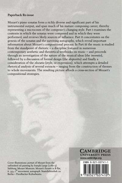 Mozart's piano sonatas form a richly diverse and significant part of his instrumental output, and span much of his mature composing career, thereby representing a microcosm of the composer's changing style. Part I examines the contexts in which the sonatas were composed and performed, and reviews likely sources of influence. Part II concentrates on the genesis of the sonatas and the surviving autographs, which reveal important information about Mozart's compositional process. In Part III the music is studied from the standpoint of rhetoric - a discipline featured in numerous contemporary aesthetic and theoretical textbooks on music - and proceeds through an investigation of the nature of the musical ideas, followed by a discussion of formal design and finally a consideration of the style. The resulting picture affords a cross-section of Mozart's compositional strategies.