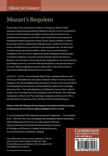 Presenting a fresh interpretation of Mozart's Requiem, Simon P. Keefe redresses a longstanding scholarly imbalance whereby narrow consideration of the text of this famously incomplete work has taken precedence over consideration of context in the widest sense. Keefe details the reception of the Requiem legend in general writings, fiction, theatre and film, as well as discussing criticism, scholarship and performance. Evaluation of Mozart's work on the Requiem turns attention to the autograph score, the document in which myths and musical realities collide. Franz Xaver Süssmayr's completion (1791-2) is also re-appraised and the ideological underpinnings of modern completions assessed. Overall, the book affirms that Mozart's Requiem, fascinating for interacting musical, biographical, circumstantial and psychological reasons, cannot be fully appreciated by studying only Mozart's activities. Broad-ranging hermeneutic approaches to the work, moreover, supersede traditionally limited discursive confines.