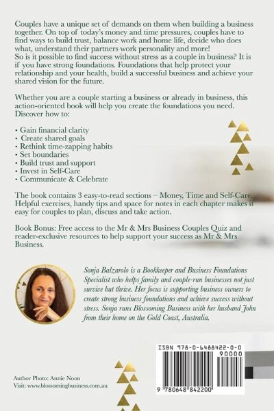 Mr & Mrs Business is an action-oriented book for couples in business. With 3 easy-to-read sections - Money, Time and Self-Care, 11 helpful exercises, handy tips and space for notes in each chapter, couples can plan, discuss and take action to achieve success without stress.