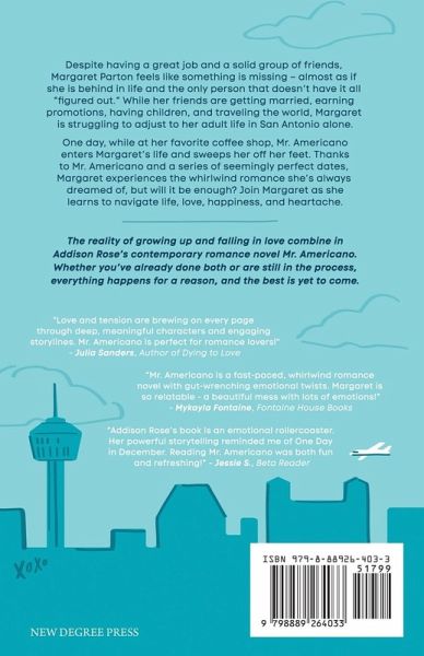 Despite having a great job and a solid group of friends, Margaret Parton feels like something is missing; almost as if she is behind in life and the only person that doesn't have it all "figured out." While her friends are getting married, earning promotions, having children, and traveling the world, Margaret is struggling to adjust to her adult life in San Antonio. Alone. One day, while at her favorite coffee shop, Mr. Americano enters Margaret's life and sweeps her off her feet. Thanks to Mr. Americano and a series of seemingly perfect dates, Margaret experiences the whirlwind romance she's always dreamed of. But will it be enough? Join Margaret as she learns to navigate life, love, happiness, and heartache. The reality of growing up and falling in love combine in Addison Rose's contemporary romance novel, Mr. Americano. Whether you've already done both or are still in the process, everything happens for a reason, and the best is yet to come.