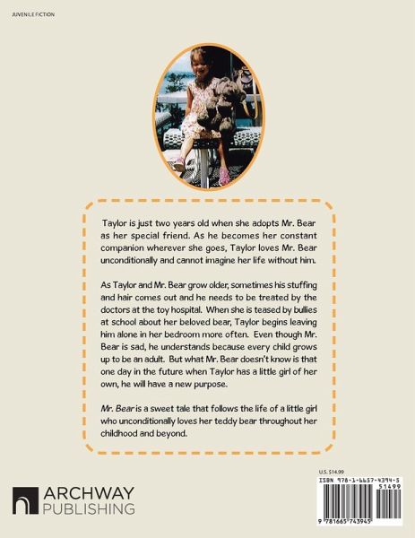 Taylor is just two years old when she adopts Mr. Bear as her special friend. As he becomes her constant companion wherever she goes, Taylor loves Mr. Bear unconditionally and cannot imagine her life without him. As Taylor and Mr. Bear grow older, sometimes his stuffing and hair comes out and he needs to be treated by the doctors at the toy hospital. When she is teased by bullies at school about her beloved bear, Taylor begins leaving him alone in her bedroom more often. Even though Mr. Bear is sad, he understands because every child grows up to be an adult. But what Mr. Bear doesn't know is…mehr