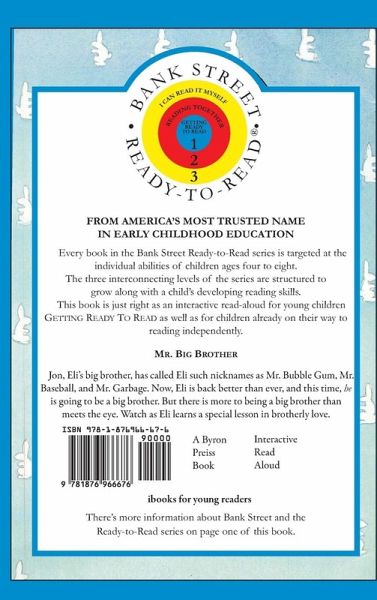 Mr. Big Brother Jon, Eli's big brother, has called Eli such nicknames as Mr. Bubble Gum, Mr. Baseball, and Mr. Garbage. Now, Eli is back better than ever, and this time, he is going to be a big brother. But there is more to being a big brother than meets the eye. Watch as Eli learns a special lesson in brotherly love. FROM AMERICA'S MOST TRUSTED NAME IN EARLY CHILDHOOD EDUCATION More than seventy years of educational research and innovative teaching have given the Bank Street College of Education the reputation as America's most trusted name in early childhood education. Because no two children are exactly alike in their development, we have designed the Bank Street Ready-to-Read series in three levels to accommodate the individual stages of reading readiness of children ages four through eight. • Level 1: GETTING READY TO READ- (PRE-K to GRADE 1) Books are perfect for reading aloud with children who are getting ready to read or are just beginning to read words or phrases. • Level 2: READING TOGETHER-(GRADES 1 to 3) Books are written especiallly for children who are on their way to reading independently but who may need help. • Level 3: I CAN READ IT MYSELF-(GRADES 2 to 3) Books are designed for children able to read on their own. They also can be enjoyed as read-alouds.