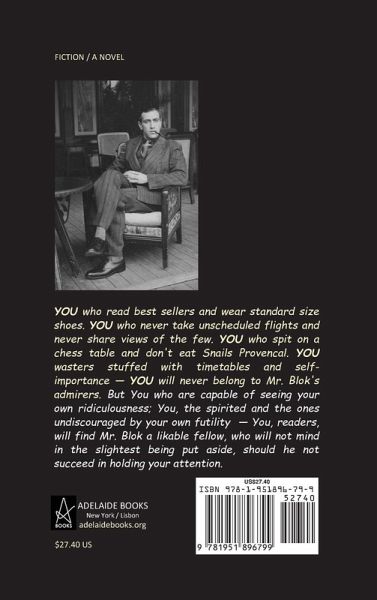In the author's own words: "YOU who read best sellers and wear standard size shoes. YOU who never take unscheduled flights and never share views of the few. YOU who spit on a chess table and don't eat Snails Provencal. YOU wasters stuffed with timetables and self-importance - YOU will never belong to Mr. Blok's admirers. But You who are capable of seeing your own ridiculousness; You, the spirited and the ones undiscouraged by your own futility - You, readers, will find Mr. Blok a likable fellow, who will not mind in the slightest being put aside, should he not succeed in holding your attention."