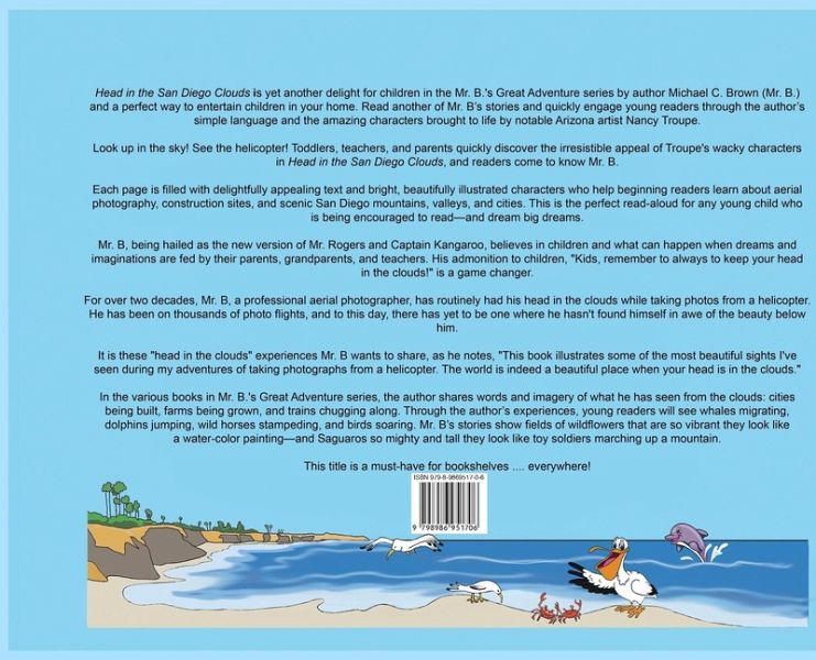 Have you ever had your head in clouds and seen the world like a bird? Perhaps you've looked out the window of an airplane and stared at the world below you. Or, maybe you've hiked to the top of a tall mountain and stopped to look around. For over twenty years, debut children's picture book author Mike Brown (Mr. B) - as an aerial photographer -.has routinely had his head in the clouds while taking photos from a helicopter. He has been on thousands of photo flights, and to this day, there's not been one where he hasn't found himself in awe of the beauty below him. Mr. B has seen cities being built, farms being grown, and trains chugging along. He has glided alongside whales migrating, dolphins jumping, wild horses stampeding, and red hawks soaring. He's fluttered over fields of wildflowers that are so vibrant they look like a watercolor painting - and hovered over Saguaros so mighty and tall they look like toy soldiers marching up a mountain. In the second book of Mr. B's Great Adventures, the author shares his visits to airline terminals where he made friends with flight attendants and taxi drivers...but his best friend is always Mr. Helicopter! While in San Diego, Mr. B sees the ocean, dolphins, and parasails. He sees Downtown San Diego and his projects from high in the clouds. All the joy and the beauty this is in a day's work! The author notes, "Head in the San Diego Clouds is another illustration of some of the most beautiful sights I've seen during my adventures - taking photographs from a helicopter. The world is beautiful when your head is in the clouds. This book is dedicated to my grandchildren...the most beautiful sight of all."