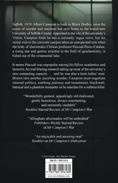 Suffolk, 1970. Albert Campion has been appointed to the role of Visitor of the University of Suffolk, but his trip to the campus takes an unexpected turn when the body of a professor is fished out of the lake. Drawn into another puzzling murder, Campion must negotiate seething jealousy, resentment, and betrayal as he searches for a ruthless killer.