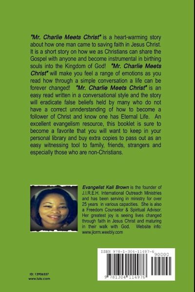 "Mr. Charlie meets Christ" is a heart-warming story about how one man came to saving faith in Jesus Christ. It is a short story on how we as Christians can share the Gospel with anyone and become instrumental in birthing souls into the Kingdom of God! "Mr. Charlie meets Christ" will make you feel a range of emotions as you read how through a simple conversation a life can be forever changed! "Mr. Charlie meets Christ" is an easy-read written in a conversational style and the story will eradicate false beliefs held by many who do not have a correct understanding of how to become a follower of Christ and know one has Eternal Life. An excellent evangelism resource and short story, this booklet is sure to become a favorite that you will want to keep in your personal library and buy extra copies to use as an easy witnessing tool to pass on to family, friends, strangers and especially those who are non-Christians.