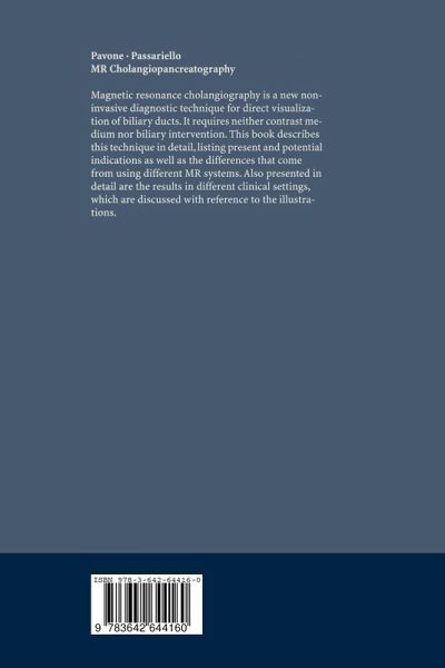 Magnetic resonance cholangiography is a new noninvasive diagnostic technique for direct visualization of biliary ducts. It requires neither contrast medium nor biliary intervention. This book describes this technique in detail, listing present and potential indications as well as the differences that come from using different MR systems. Also presented in detail are the results in different clinical settings, which are discussed with reference to the illustrations.