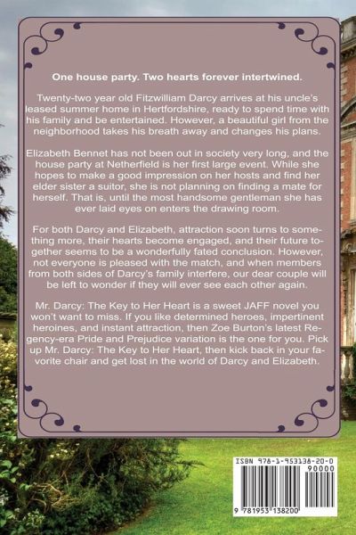 One house party. Two hearts forever intertwined. Twenty-two year old Fitzwilliam Darcy arrives at his uncle's leased summer home in Hertfordshire, ready to spend time with his family and be entertained. However, a beautiful girl from the neighborhood takes his breath away and changes his plans. Elizabeth Bennet has not been out in society very long, and the house party at Netherfield is her first large event. While she hopes to make a good impression on her hosts and find her elder sister a suitor, she is not planning on finding a mate for herself. That is, until the most handsome gentleman she has ever laid eyes on enters the drawing room. For both Darcy and Elizabeth, attraction soon turns to something more, their hearts become engaged, and their future together seems to be a wonderfully fated conclusion. However, not everyone is pleased with the match, and when members from both sides of Darcy's family interfere, our dear couple will be left to wonder if they will ever see each other again. Mr. Darcy: The Key to Her Heart is a sweet JAFF novel you won't want to miss. If you like determined heroes, impertinent heroines, and instant attraction, then Zoe Burton's latest Regency-era Pride and Prejudice variation is the one for you. Pick up Mr. Darcy: The Key to Her Heart, then kick back in your favorite chair and get lost in the world of Darcy and Elizabeth.