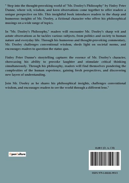 Texte à corriger : "Mr. Dooley's Philosophy" by Finley Peter Dunne is a collection of satirical essays that capture the wit and wisdom of Mr. Dooley, a fictional Irish bartender in Chicago. Through his monologues, Mr. Dooley offers humorous and insightful commentary on various social, political, and cultural issues of the late 19th and early 20th centuries. The text covers a wide range of topics, including the complexities of international relations, the absurdities of war, and the challenges of domestic life. Dunne uses Mr. Dooley's character to critique the follies of human nature and the contradictions inherent in society. The essays are characterized by their use of dialect, which adds authenticity and charm to Mr. Dooley's voice. Dunne's work is notable for its ability to address serious subjects with humor and for its reflection of the immigrant experience in America. The collection also highlights the enduring relevance of Mr. Dooley's observations, as many of the issues he discusses remain prevalent today. Through Mr. Dooley, Dunne provides a unique perspective on the world, blending humor with keen social commentary.