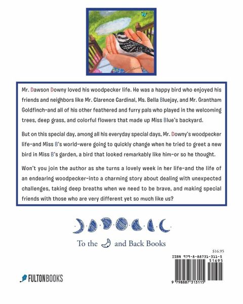 Mr. Dawson Downy loved his woodpecker life. He was a happy bird who enjoyed his friends and neighbors like Mr. Clarence Cardinal, Ms. Bella Bluejay, and Mr. Grantham Goldfinch--and all of his other feathered and furry pals who played in the welcoming trees, deep grass, and colorful flowers that made up Miss Blue's backyard. But on this special day, among all his everyday special days, Mr. Downy's woodpecker life--and Miss B's world--were going to quickly change when he tried to greet a new bird in Miss B's garden, a bird that looked remarkably like him--or so he thought. Won't you join the author as she turns a lovely week in her life--and the life of an endearing woodpecker--into a charming story about dealing with unexpected challenges, taking deep breaths when we need to be brave, and making special friends with those who are very different yet so much like us?