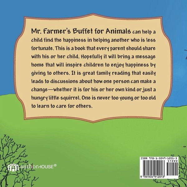 Mr. Farmer's Buffet for Animals can help a child find the happiness in helping another who is less fortunate. This is a book that every parent should share with his or her child. Hopefully it will bring a message home that will inspire children to enjoy happiness by giving to others. It is great family reading that easily leads to discussions about how one person can make a change-whether it is for his or her own kind or just a hungry little squirrel. One is never too young or too old to learn to care for others.