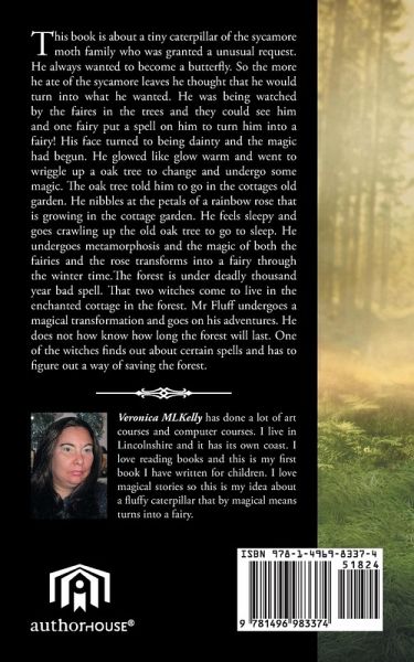 This book is about a tiny caterpillar of the sycamore moth family who was granted a unusual request. He always wanted to become a butterfly. So the more he ate of the sycamore leaves he thought that he would turn into what he wanted. He was being watched by the faires in the trees and they could see him and one fairy put a spell on him to turn him into a fairy! His face turned to being dainty and the magic had begun. He glowed like glow warm and went to wriggle up a oak tree to change and undergo some magic. The oak tree told him to go in the cottages old garden. He nibbles at the petals of a rainbow rose that is growing in the cottage garden. He feels sleepy and goes crawling up the old oak tree to go to sleep. He undergoes metamorphosis and the magic of both the fairies and the rose transforms into a fairy through the winter time.The forest is under deadly thousand year bad spell. That two witches come to live in the enchanted cottage in the forest. Mr Fluff undergoes a magical transformation and goes on his adventures. He does not how know how long the forest will last. One of the witches finds out about certain spells and has to figure out a way of saving the forest.