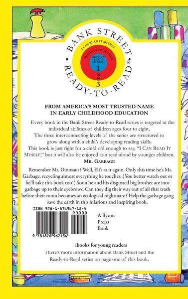 Remember Mr. Dinosaur? Well, Eli's at it again. Only this time he's Mr. Garbage, recycling almost everything he touches. (You better watch out or he'll take this book too!) Soon he and his disgusted big brother are into garbage up to their eyebrows. Can they dig their way out of all that trash before their room becomes an ecological nightmare? Help the garbage gang save the earth in this hilarious and inspiring book. ¿FROM AMERICA'S MOST TRUSTED NAME IN EARLY CHILDHOOD EDUCATION More than seventy years of educational research and innovative teaching have given the Bank Street College of Education the reputation as America's most trusted name in early childhood education. Because no two children are exactly alike in their development, we have designed the Bank Street Ready-to-Read series in three levels to accommodate the individual stages of reading readiness of children ages four through eight. • Level 1: GETTING READY TO READ- (PRE-K to GRADE 1) Books are perfect for reading aloud with children who are getting ready to read or are just beginning to read words or phrases. • Level 2: READING TOGETHER-(GRADES 1 to 3) Books are written especiallly for children who are on their way to reading independently but who may need help. • Level 3: I CAN READ IT MYSELF-(GRADES 2 to 3) Books are designed for children able to read on their own. They also can be enjoyed as read-alouds.