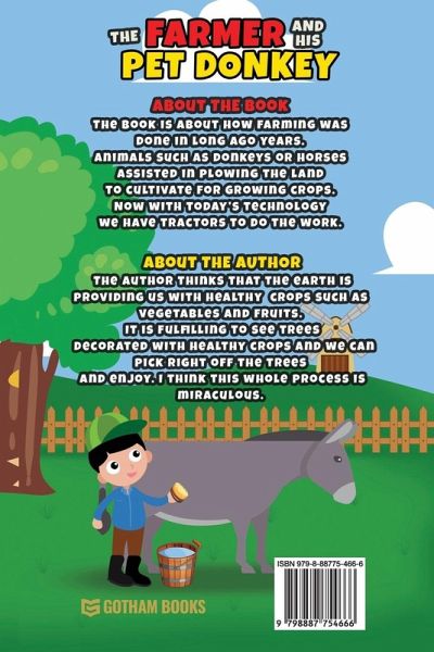 Mr. Grumpy's Farm The book is about farm animals and how each animal produce to the earth in different ways. And how important it is to love and take care of such animals. The Farmer and His Pet Donkey The book is about how farming was done in long ago years. Animals such as donkeys or horses assisted in plowing the land to cultivate for growing crops. Now with today's technology we have tractors to do the work.