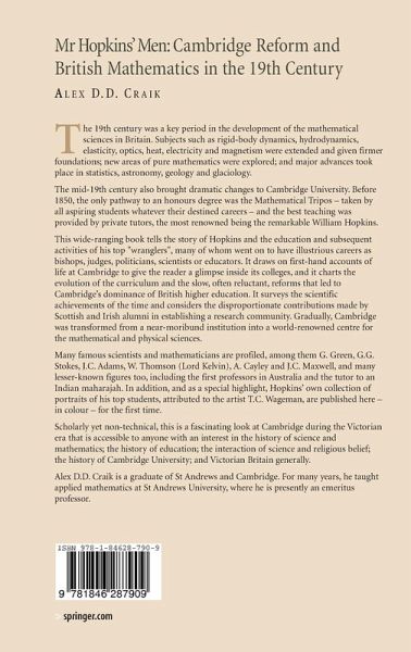 A few years ago, Alex Craik, a mathematician from the university of St. Andrews, found an obscure collection of portraits in the Wren Library of Trinity College at Cambridge University. The people depicted all had one thing in common: they had been pupils of the famous 19th-century Cambridge private mathematics tutor William Hopkins. He had taught a group that included George Stokes, William Thomson and James Clerk Maxwell, as well as other less famous but still highly successful scientists. Inspired by this finding, Craik has written Mr Hopkins' Men, which tells the story of Hopkins and his top students. The book provides a fascinating insight into 19th-century Cambridge college life, and charts how the university evolved from an outdated and stagnating institution into the world-renowned centre for mathematical and scientific research it is today. Many of these reforms were, in fact, down to Hopkins and the men he tutored." -Physics World, June 2008
