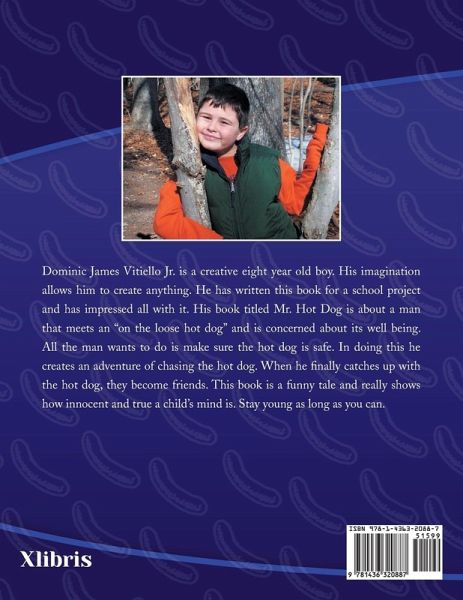 Dominic James Vitiello Jr. is a creative eight year old boy. His imagination allows him to create anything. He has written this book for a school project and has impressed all with it. His book titled Mr. Hot Dog is about a man that meets an "on the loose hot dog" and is concerned about its well being. All the man wants to do is make sure the hot dog is safe. In doing this he creates an adventure of chasing the hot dog. When he finally catches up with the hot dog, they become friends. This book is a funny tale and really shows how innocent and true a child's mind is. Stay young as long as you can.