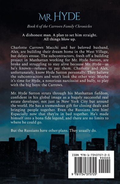 A dishonest man. A plan to set him straight. All things blow up. Charlotte Carrows Macchi and her beloved husband, Alex, are building their dream home in the West Village, but delays ensue. The subcontractors, fresh off a building project in Manhattan working for Mr. Hyde Sutton, are broke and struggling to stay alive because Mr. Hyde-as he's known-refuses to pay them. Charlotte and Alex, unfortunately, know Hyde Sutton personally. They believe the subcontractors and won't look the other way. Maybe it's time for Hyde, a notorious narcissist and bully, to play with the big boys: the Carrows. Mr. Hyde Sutton struts through his Manhattan fiefdom, confident in his global image as a hugely successful real estate developer, not just in New York City but around the world. He has a tremendous gift for closing deals and bringing people together. Even the Russians love him! Especially now that they're in bed together. He's made himself into a bona fide legend, and there are no limits to where he could go. But the Russians have other plans. They usually do. Mr. Hyde is a blend of satirical fiction, humor, billionaire mystery/romance, and is a stand-alone read.