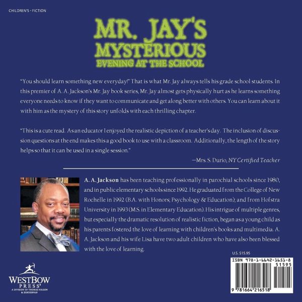"You should learn something new everyday!" That is what Mr. Jay always tells his grade school students. In this premier of A. A. Jackson's Mr. Jay book series, Mr. Jay almost gets physically hurt as he learns something everyone needs to know if they want to communicate and get along better with others. You can learn about it with him as the mystery of this story unfolds with each thrilling chapter. "This is a cute read. As an educator I enjoyed the realistic depiction of a teacher's day. The inclusion of discussion questions at the end makes this a good book to use with a classroom. Additionally, the length of the story helps so that it can be used in a single session." -Mrs. S. Durio, NY Certified Teacher