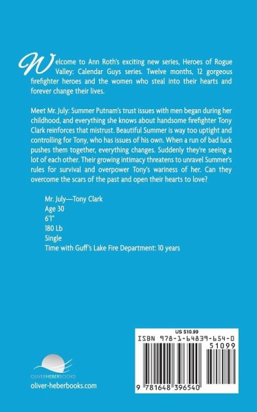 Welcome to Ann Roth's exciting new series, Heroes of Rogue Valley: Calendar Guys series. Twelve months, 12 gorgeous firefighter heroes and the women who steal into their hearts and forever change their lives. Meet Mr. July: Summer Putnam's trust issues with men began during her childhood, and everything she knows about handsome firefighter Tony Clark reinforces that mistrust. Beautiful Summer is way too uptight and controlling for Tony, who has issues of his own. When a run of bad luck pushes them together, everything changes. Suddenly they're seeing a lot of each other. Their growing intimacy threatens to unravel Summer's rules for survival and overpower Tony's wariness of her. Can they overcome the scars of the past and open their hearts to love? Mr. July-Tony Clark Age 306'1" 180 Lb SingleTime with Guff's Lake Fire Department: 10 years