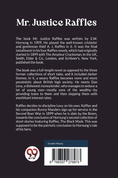 The book Mr. Justice Raffles was written by E.W. Hornung in 1909. He played the well-known cricketer and gentleman thief A. J. Raffles in it. It was the final installment in his four Raffles novels, which had originally started in 1899 with The Amateur Cracksman. In the UK, Smith, Elder & Co., London, and Scribner's, New York, published the book. The book was a full-length novel as opposed to the three former collections of short tales, and it included darker themes. In it, a weary Raffles becomes more and more pessimistic about British high society. He meets Dan Levy, a dishonest moneylender, who manages to seduce a lot of young men-mostly sons of the wealthy-by providing loans to them and then slapping them with exorbitant interest rates. Raffles decides to discipline Levy on his own. Raffles and his companion Bunny Manders sign up for service in the Second Boer War in 1899 when he is slain by the Boers, towards the conclusion of Hornung's second collection of short stories featuring Raffles, The Black Mask. This was supposed to be the patriotic conclusion to Hornung's tale of his hero.