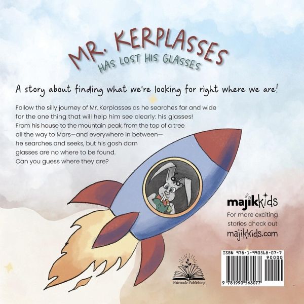 A story about finding what we're looking for right where we are! Follow the silly journey of Mr. Kerplasses as he searches far and wide for the one thing that will help him see clearly: his glasses! From his house to the mountain peak, from the top of a tree all the way to Mars-and everywhere in between- he searches and seeks, but his gosh darn glasses are nowhere to be found. Can you guess where they are?