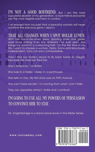 I'm not a good boyfriend. But I am the most successful jeweler of my generation, a loyal friend and some say the most eligible bachelor in London. I've learned from my past that a beautiful woman will never outshine the precious gems I deal in. Work is both my wife and my mistress. That all changes when I spot Hollie Lumen. With her hand-me-down dress, dazzling smile and green eyes more striking than any emerald I've ever seen, she brings my world to a screeching halt. For the first time in my life, I want to impress a woman. Feisty, funny and ferociously independent, turns out she's unimpressible. Then I find out Hollie's about to fly back home to Oregon because her boss just fired her. She's American. I'm British. She lives in a trailer. I sleep in a penthouse. She sells on Etsy. My first store was on Fifth Avenue. She can't bear secrets. I'm running from what I can't hide. They say opposites attract. Hollie and I combust. I'm going to use all my powers of persuasion to convince her to stay. Mr. Knightsbridge is a stand-alone romance in the Mister Series. For Beck and Stella's story - read Mr. Mayfair For Dexter and Hollie's story - read Mr. Knightsbridge For Gabriel and Autumn's story - read Mr. Smithfield For Joshua and Hartford's story - read Mr. Park Lane For Tristan and Parker's story - read Mr. Notting Hill