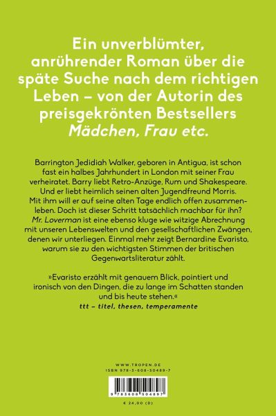 Barrington Jedidiah Walker, geboren in Antigua, ist schon fast ein halbes Jahrhundert in London mit seiner Frau verheiratet. Barry liebt Retro-Anzüge, Rum und Shakespeare. Und er liebt heimlich seinen alten Jugendfreund Morris. Mit ihm will er auf seine alten Tage endlich offen zusammenleben. Doch ist dieser Schritt tatsächlich machbar für ihn? Mr. Loverman ist eine ebenso kluge wie witzige Abrechnung mit unseren Lebenswelten und den gesellschaftlichen Zwängen, denen wir unterliegen. Einmal mehr zeigt Bernardine Evaristo, warum sie zu den wichtigsten Stimmen der britischen Gegenwartsliteratur zählt.