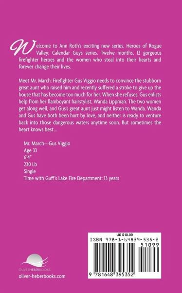 Welcome to Ann Roth's exciting new series, Heroes of Rogue Valley: Calendar Guys series. Twelve months, 12 gorgeous firefighter heroes and the women who steal into their hearts and forever change their lives. Meet Mr. March: Firefighter Gus Viggio needs to convince the stubborn great aunt who raised him and recently suffered a stroke to give up the house that has become too much for her. When she refuses, Gus enlists help from her flamboyant hairstylist, Wanda Lippman. The two women get along well, and Gus's great aunt just might listen to Wanda. Wanda and Gus have both been hurt by love, and neither is ready to venture back into those dangerous waters anytime soon. But sometimes the heart knows best... * Mr. March-Gus Viggio * Age 33 * 6'4" * 230 Lb * Single * Time with Guff's Lake Fire Department: 13 years