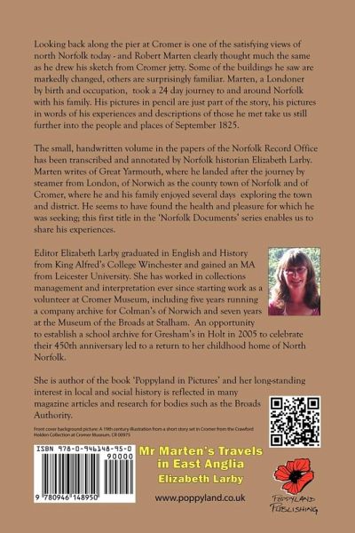 The small, handwritten volume which is Robert Marten's diary of his travels in East Anglia is carefully conserved in the Norfolk Record Office. Marten writes of Great Yarmouth, where he landed after the journey by steamer from London, of Norwich as the county town of Norfolk and of Cromer, where he and his family enjoyed several days exploring. His picture of the county in September 1825, combined with the detail in his pencil sketches, reveals an early 19th century world to us. Editor Elizabeth Larby has carefully annotated the text, providing a context to further our understanding of the journey and the age.