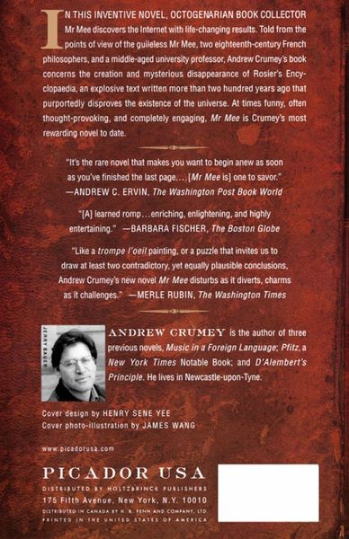 A New York Times Notable Book of the Year In this inventive novel, octogenarian book collector Mr. Mee discovers the Internet with life-changing results. Told from the points of view of the guileless Mr. Mee, two eighteenth century French philosophers, and a middle-aged university professor, Andrew Crumey's book concerns the creation and mysterious disappearance of Rosier's Encyclopedia, an explosive text written more than two hundred years ago that purportedly disproves the existence of the universe. At times funny, often thought-provoking, and completely engaging, Mr. Mee is Crumey's most rewarding novel to date.