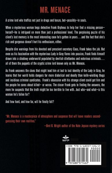 A criminal underworld. A gorgeous dame. A crime boss dealing in immortal souls. Mr. Menace is a supernatural noir experience you won't forget. When a wealthy and gorgeous woman asks P.I. Frank Orpheus to find her missing identity, he just can't say no-even if the case leads him into a criminal underworld more horrific than anything he ever imagined. . . Private detective Frank Orpheus, searching for a mysterious woman's missing identity, finds himself entangled in a web of underworld characters far nastier than any he's ever met, all of them puppets of a crime boss known only as Mr. Menace, a dark figure who traffics not just in drugs and booze, but-possibly-in souls. "Mr. Menace is a masterpiece of atmosphere and suspense that will leave readers second-guessing their own realities."-Bret R. Wright author of the Nate Jepson mystery series