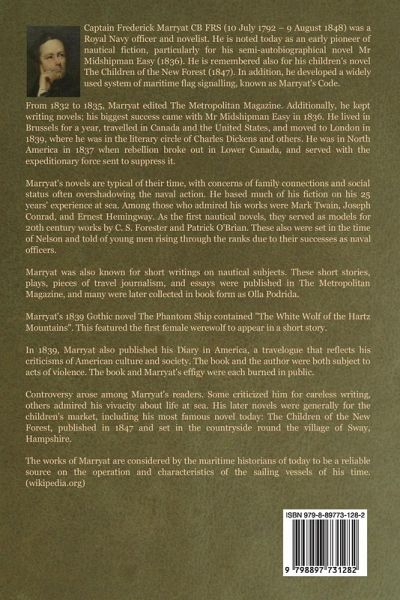 Mr Midshipman Easy is an 1836 novel by Frederick Marryat, a retired captain in the British Royal Navy. The novel is set during the Napoleonic Wars, in which Marryat himself served with distinction. Easy is the son of foolish parents, who spoiled him. His father regards himself as a philosopher, with a firm belief in the "rights of man, equality, and all that; how every person was born to inherit his share of the earth, a right at present only admitted to a certain length that is, about six feet, for we all inherit our graves, and are allowed to take possession without dispute." But no one would listen to Mr Easy's philosophy. The women would not acknowledge the rights of men, whom they declared always to be in the wrong; and, as the gentlemen who visited Mr Easy were all men of property, they could not perceive the advantages of sharing with those who had none. However, they allowed him to discuss the question, while they discussed his port wine. The wine was good, if the arguments were not, and we must take things as we find them in this world." ... The novel was adapted as an adventure film twice in the UK: in 1915 as a silent film, Midshipman Easy directed by Maurice Elvey, and in 1935 with sound, Midshipman Easy directed by Carol Reed. (wikipedia.org) About the Author Captain Frederick Marryat CB FRS (10 July 1792 - 9 August 1848) was a Royal Navy officer and novelist. He is noted today as an early pioneer of nautical fiction, particularly for his semi-autobiographical novel Mr Midshipman Easy (1836). He is remembered also for his children's novel The Children of the New Forest (1847). In addition, he developed a widely used system of maritime flag signalling, known as Marryat's Code. From 1832 to 1835, Marryat edited The Metropolitan Magazine. Additionally, he kept writing novels; his biggest success came with Mr Midshipman Easy in 1836. He lived in Brussels for a year, travelled in Canada and the United States, and moved to London in 1839, where he was in the literary circle of Charles Dickens and others. He was in North America in 1837 when rebellion broke out in Lower Canada, and served with the expeditionary force sent to suppress it. Marryat's novels are typical of their time, with concerns of family connections and social status often overshadowing the naval action. He based much of his fiction on his 25 years' experience at sea. Among those who admired his works were Mark Twain, Joseph Conrad, and Ernest Hemingway. As the first nautical novels, they served as models for 20th century works by C. S. Forester and Patrick O'Brian. These also were set in the time of Nelson and told of young men rising through the ranks due to their successes as naval officers. Marryat was also known for short writings on nautical subjects. These short stories, plays, pieces of travel journalism, and essays were published in The Metropolitan Magazine, and many were later collected in book form as Olla Podrida. Marryat's 1839 Gothic novel The Phantom Ship contained "The White Wolf of the Hartz Mountains". This featured the first female werewolf to appear in a short story. In 1839, Marryat also published his Diary in America, a travelogue that reflects his criticisms of American culture and society. The book and the author were both subject to acts of violence. The book and Marryat's effigy were each burned in public. Controversy arose among Marryat's readers. Some criticized him for careless writing, others admired his vivacity about life at sea. His later novels were generally for the children's market, including his most famous novel today: The Children of the New Forest, published in 1847 and set in the countryside round the village of Sway, Hampshire. ...(wikipedia.org)