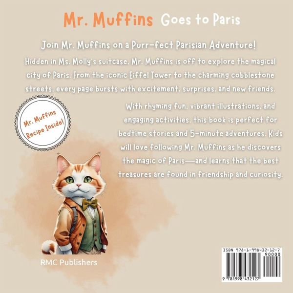 Sometimes, it takes a bit of creativity, To begin an adventure in a new lovely city! It might surprise you how friendships can blend, When Mr. Muffins meets someone, an unexpected friend, in the end. Who exactly is this adventurous and charming orange-and-white cat named Mr. Muffins?Discover the World with Mr. Muffins, an Adventure Series for Curious Kids! Follow Mr. Muffins and a disoriented mouse as they explore the magical streets of Paris. From the Eiffel Tower to the Seine River, this adventure will have kids talking about all things French. Do you have a favorite French food? Mr. Muffins Goes to Paris is part of a delightful series of rhyming picture books, perfect for boys and girls ages 6-8. These books combine enchanting stories, colorful illustrations, and engaging activities to inspire young readers. Mr. Muffins, the ever-so-handsome fluffy cat, embarks on thrilling journeys across the globe. He often learns new ideas and words, sometimes in another language, meets new friends, and has much to ponder and reflect on. Each book in this series includes: Valuable Lesson: Each tale imparts an important life lesson for kids. Five Reflection Questions: To help children think deeply about the story. Ten Tricky Words: Definitions and translations for foreign words or concepts. Math Question: Discover the answer within an image. Themed Recipe: Straight from Mr. Muffin's own cookbook! With 5-minute stories, this series is ideal for bedtime, classroom read-alouds, or family storytime. Whether your goal is to support your child's reading education or find bedtime stories to bond over, Mr. Muffins Tales will make learning and reading skills fun. Mr. Muffins Goes to Paris story features: Entertaining Story: Centered around an important idea or concept. Vibrant Illustrations: Full-color artwork that brings friendly animal and human characters to life. Cultural Explorations: Learning about real-life iconic landmarks with a cultural twist. Engaging Language: Easy-to-read text with occasional challenging words to improve vocabulary. Globetrotting Adventures: Join Mr. Muffins and make friendships in exotic landscapes. Come along on Mr. Muffins' magical journey to enjoy new activities, making learning a delightful experience for young readers.