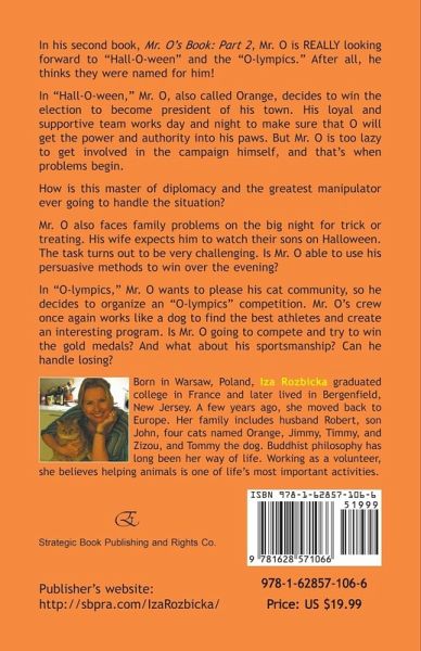 In his second book, Mr. O's Book: Part 2, Mr. O is REALLY looking forward to "Hall-O-ween" and the "O-lympics." After all, he thinks they were named for him! In "Hall-O-ween," Mr. O, also called Orange, decides to win the election to become president of his town. His loyal and supportive team works day and night to make sure that O will get the power and authority into his paws. But Mr. O is too lazy to get involved in the campaign himself, and that's when problems begin. How is this master of diplomacy and the greatest manipulator ever going to handle the situation? Mr. O also faces family problems on the big night for trick or treating. His wife expects him to watch their sons on Halloween. The task turns out to be very challenging. Is Mr. O able to use his persuasive methods to win over the evening? In "O-lympics," Mr. O wants to please his cat community, so he decides to organize an "O-lympics" competition. Mr. O's crew once again works like a dog to find the best athletes and create an interesting program. Is Mr. O going to compete and try to win the gold medals? And what about his sportsmanship? Can he handle losing? Born in Warsaw, Poland, Iza Rozbicka graduated college in France and later lived in Bergenfield, New Jersey. A few years ago, she moved back to Europe. Her family includes husband Robert, son John, four cats named Orange, Jimmy, Timmy, and Zizou, and Tommy the dog. Buddhist philosophy has long been her way of life. Working as a volunteer, she believes helping animals is one of life's most important activities. Publisher's website: http://sbpra.com/IzaRozbicka