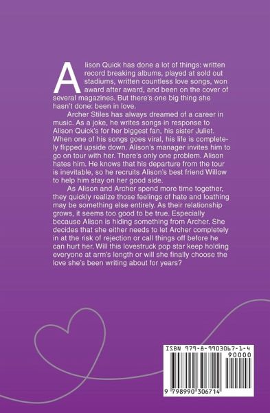 Alison Quick has done a lot of things: written record breaking albums, played at sold out stadiums, written countless love songs, won award after award, and been on the cover of several magazines. But there's one big thing she hasn't done: been in love. Archer Stiles has always dreamed of a career in music. As a joke, he writes songs in response to Alison Quick's for her biggest fan, his sister Juliet. When one of his songs goes viral, his life is completely flipped upside down. Alison's manager invites him to go on tour with her. There's only one problem. Alison hates him. He knows that his departure from the tour is inevitable, so he recruits Alison's best friend Willow to help him stay on her good side. As Alison and Archer spend more time together, they quickly realize those feelings of hate and loathing may be something else entirely. As their relationship grows, it seems too good to be true. Especially because Alison is hiding something from Archer. She decides that she either needs to let Archer completely in at the risk of rejection or call things off before he can hurt her. Will this lovestruck pop star keep holding everyone at arm's length or will she finally choose the love she's been writing about for years?
